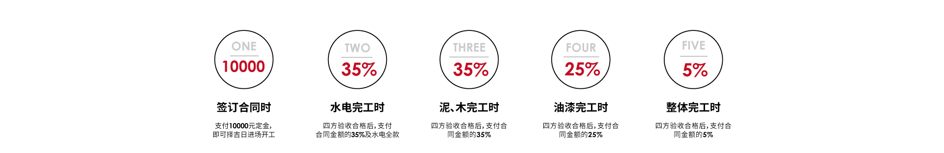 堅持真正的先裝修,后付款。簽訂合同時只需支付10000元的定金即可進場開工,根據施工進度進行階段款支付,更放心,更安心。